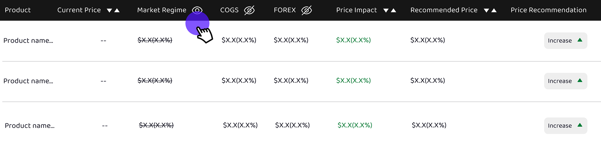 With a show/hide affordance at the column headers, and a percentage next to the actual value, Analysts are able to see how each of the three factors impacted the recommended price.