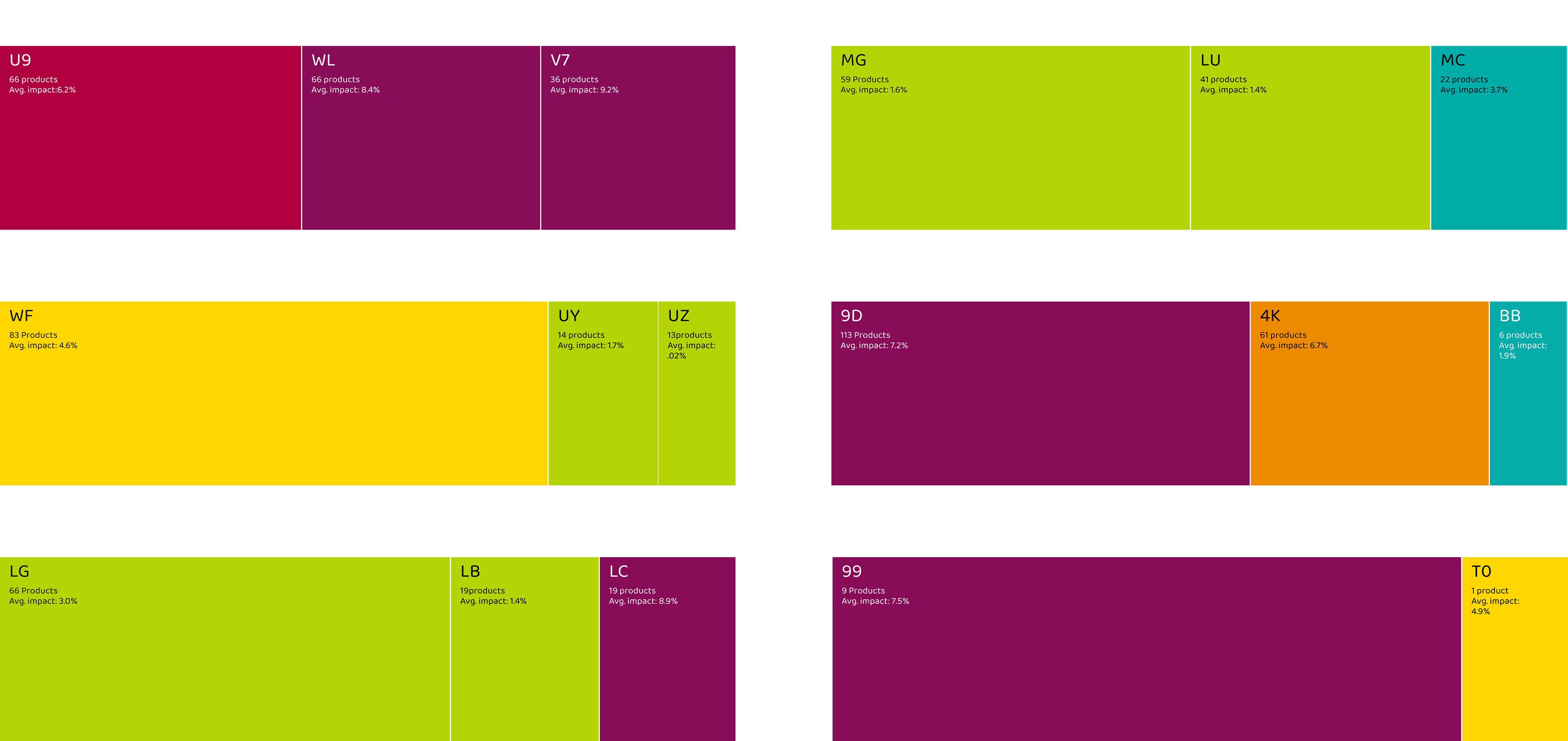 The size of each piece is dictated by the number of products it carries, while the color represents the absolute percent change in price across all the products. Large boxes that are dark red mean there is a lot of change and a lot of products will be impacted.