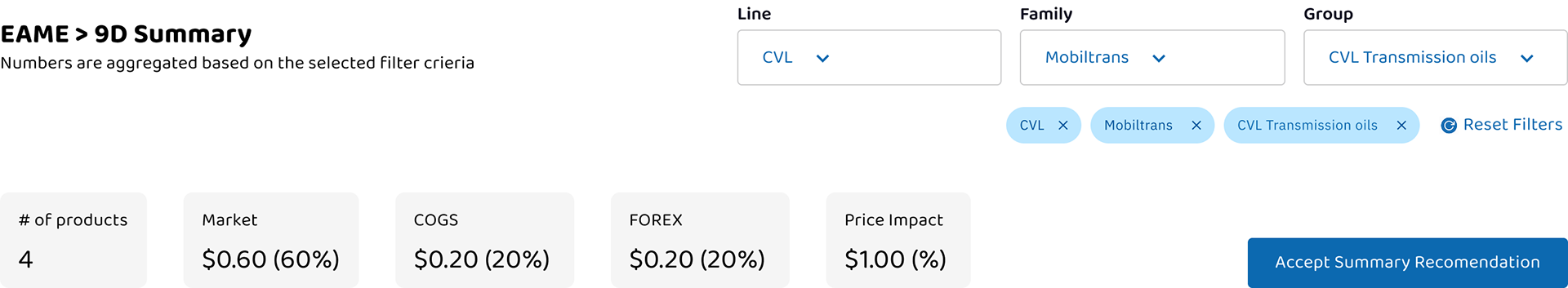 Once users had filtered down to their desired level (geography, product family, etc..), they wanted to see a summary of the metrics. They also expressed the desire to take a bulk action on all of the queried products.