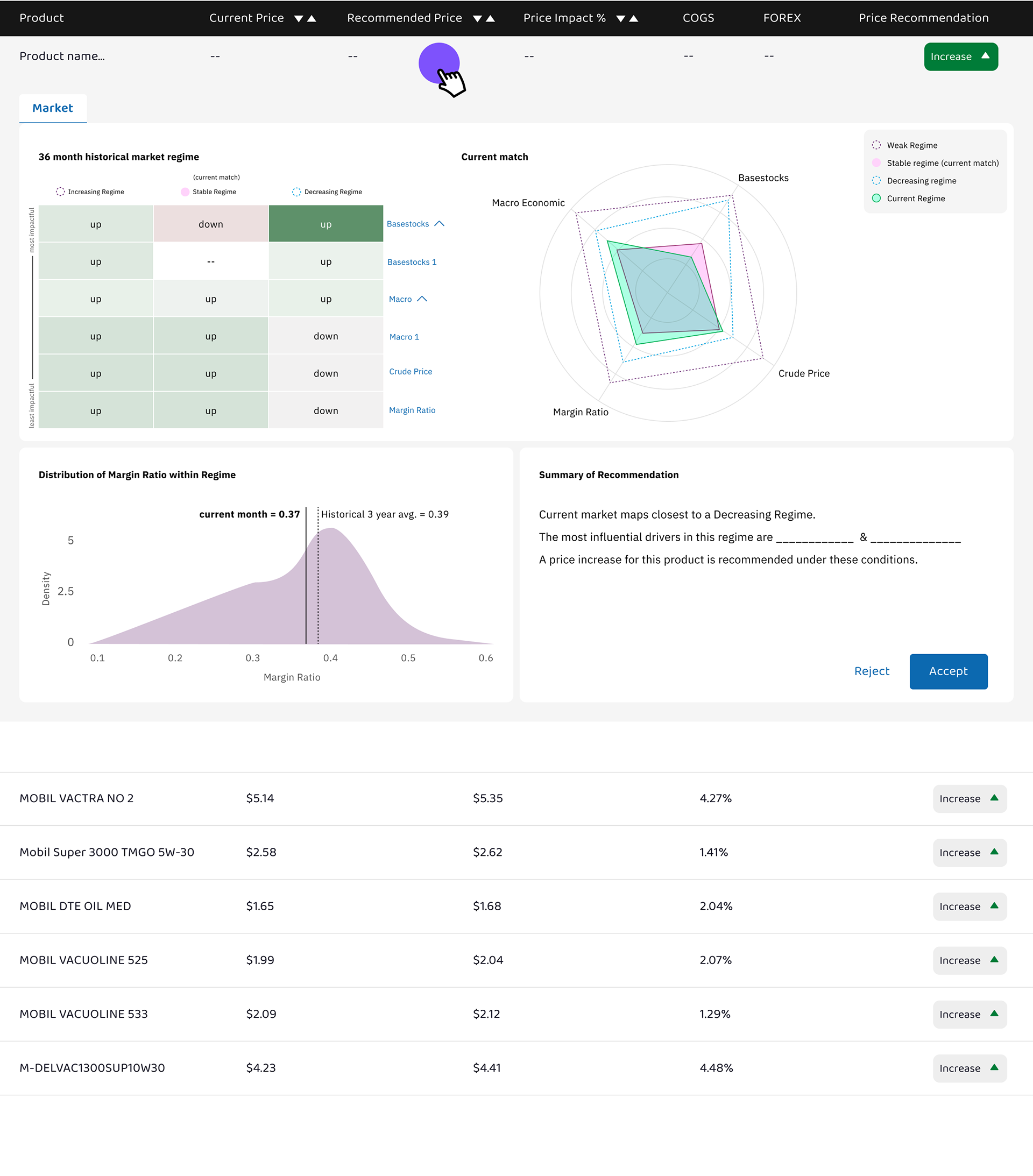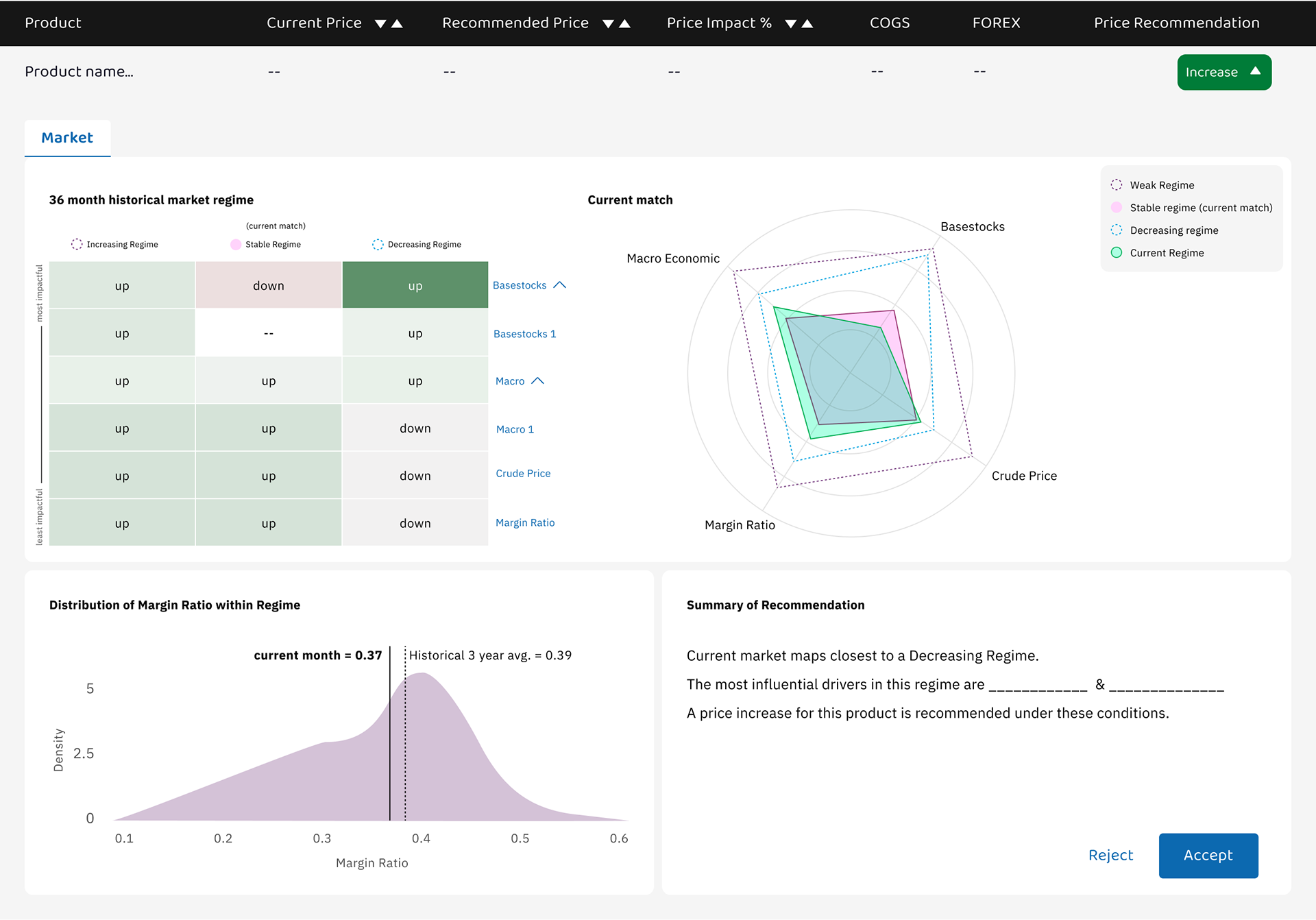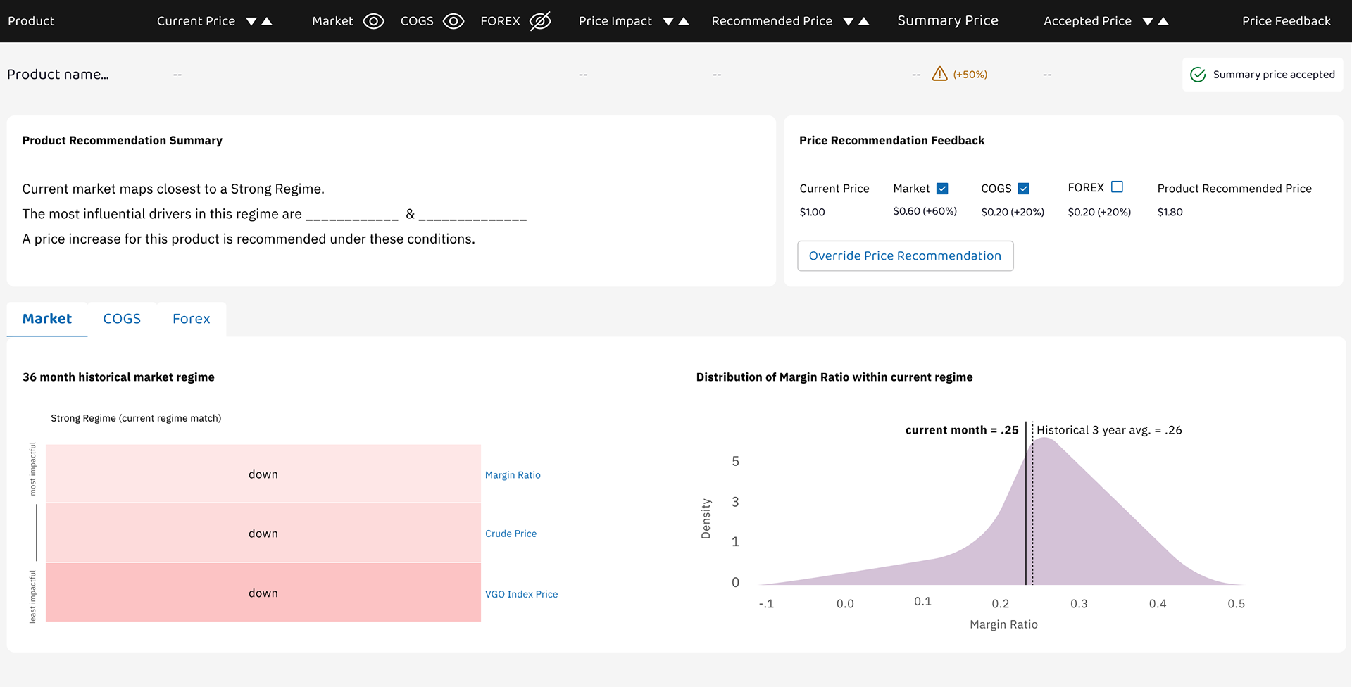 Users are able to drill down to the individual product level and see what factors are influencing the current price. This includes what 'market regime' is currently prevailing, how the factors match the current regime, and the margin ratio distribution.