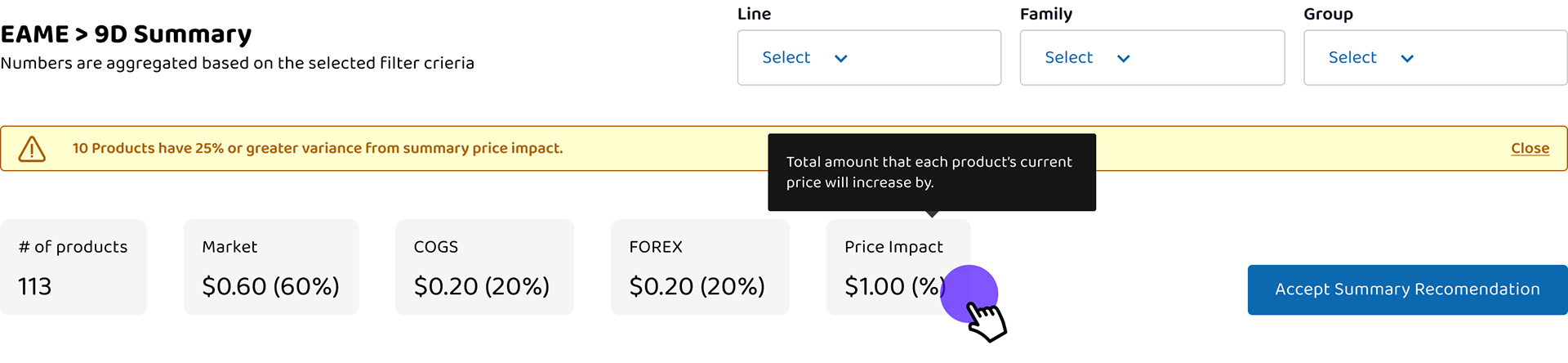 With a catalog that spans thousands of products, users needed to understand where the biggest price impacts are expected to occur, and what factors are driving those changes.